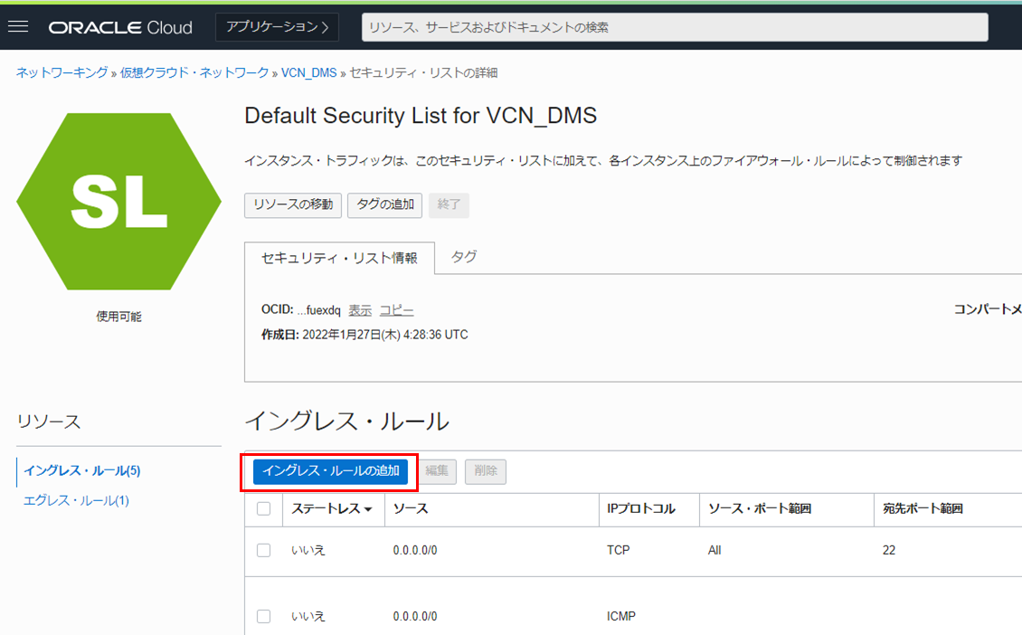 セキュリティリスト の一覧から Default Security List for VCN名 を選択します。