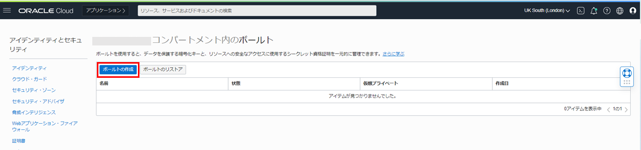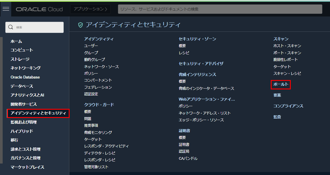 OCIコンソール・メニューから アイデンティティとセキュリティ → ボールト に移動します。