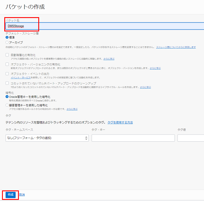 バケットの作成 ダイアログで バケット名 に任意の名前を入力します。