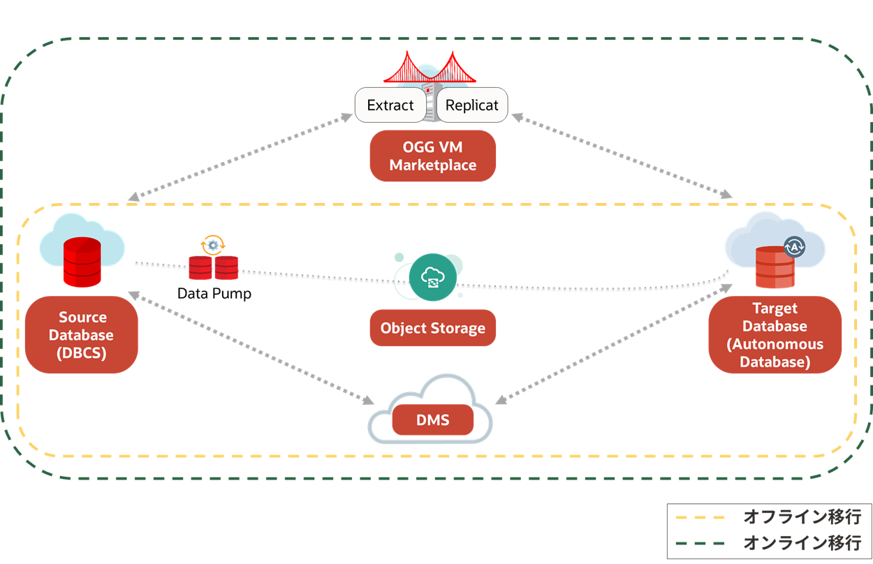- オンライン移行 - ソース・データベースのポイント・イン・タイム・コピーがターゲット・データベースに作成されるのに加え、内部的にOracle GoldenGateによるレプリケーションを利用しているため、移行中のソース・データベースへの変更も全てコピーされます。そのため、アプリケーションをオンラインのまま移行を行うことが可能で、移行に伴うアプリケーションのダウンタイムを極小化することができます。