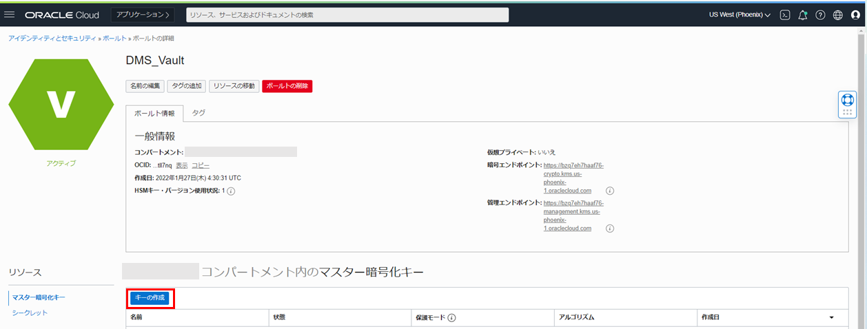作成したボールトをクリックし、 マスター暗号化キー で キーの作成 をクリックします。