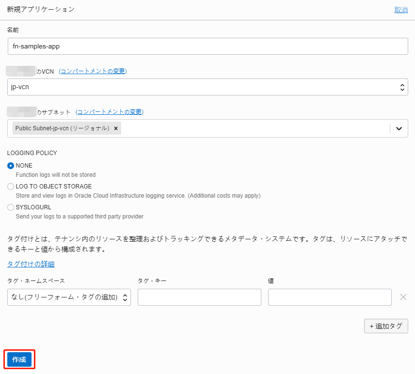 - サブネット:Functionを実行するサブネット。今回は、Oracle Functionsハンズオンで作成したVCNのサブネットを指定。