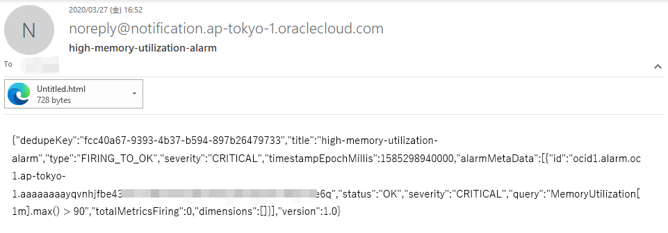 5分~10分程度経つと、メモリ使用率が90%を超えて、アラームメールが送信されます。