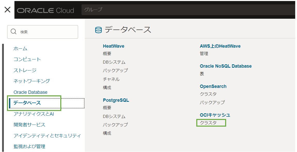 画面左上のハンバーガーメニューから、「データベース」を選択し、「OCIキャッシュ」の中の「キャッシュ」を選択します。