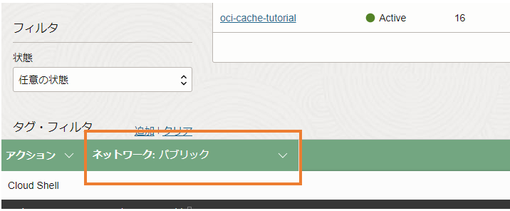 Cloud ShellをOCI Cacheと同じVCNに配置するための設定を行います。Cloud Shellの上部にある、「ネットワーク:パブリック」を選択します。