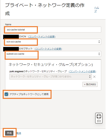 名前は任意の名前で問題ありませんが、ここではoci-cache-tutorialとしています。VCNとサブネットは、OCI Cacheを作成する際に一緒に作成したVCNとサブネットを選択します。また、「アクティブなネットワークとして使用」のチェックボックスにチェックを入れます。その後、「作成」を選択します。