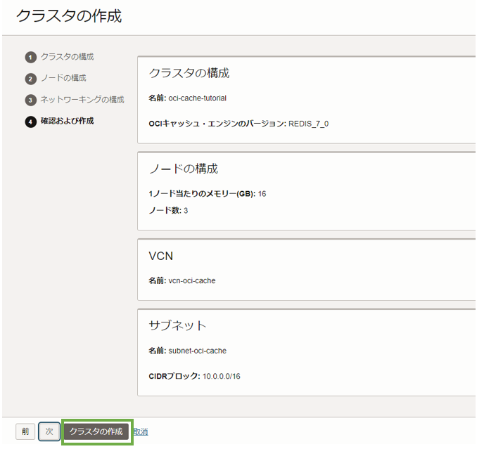 OCIキャッシュのクラスタ画面が開いたら、クラスタの作成を選択します。