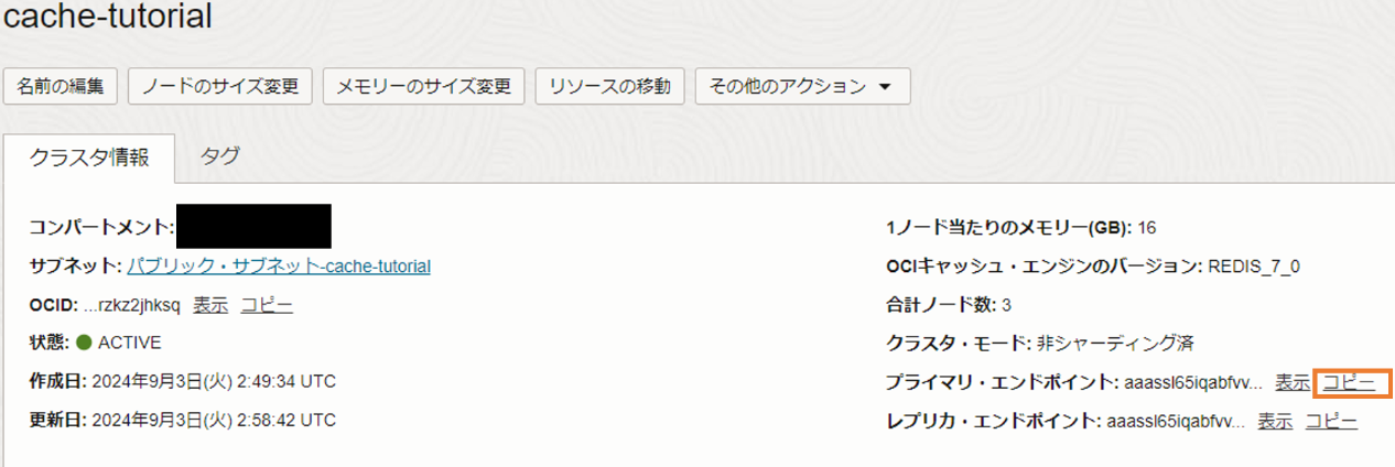 - キャッシュ・サーバーのホスト:控えておいたOCI Cacheのエンドポイント