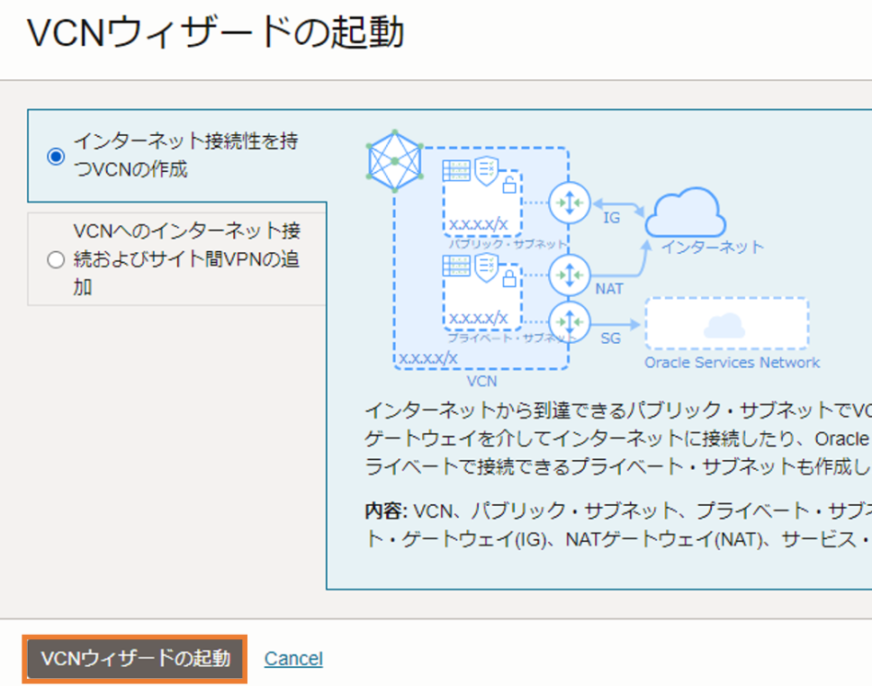 今回は簡単にVCNを作成するため、「VCNウィザードの起動」を選択します。
