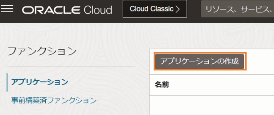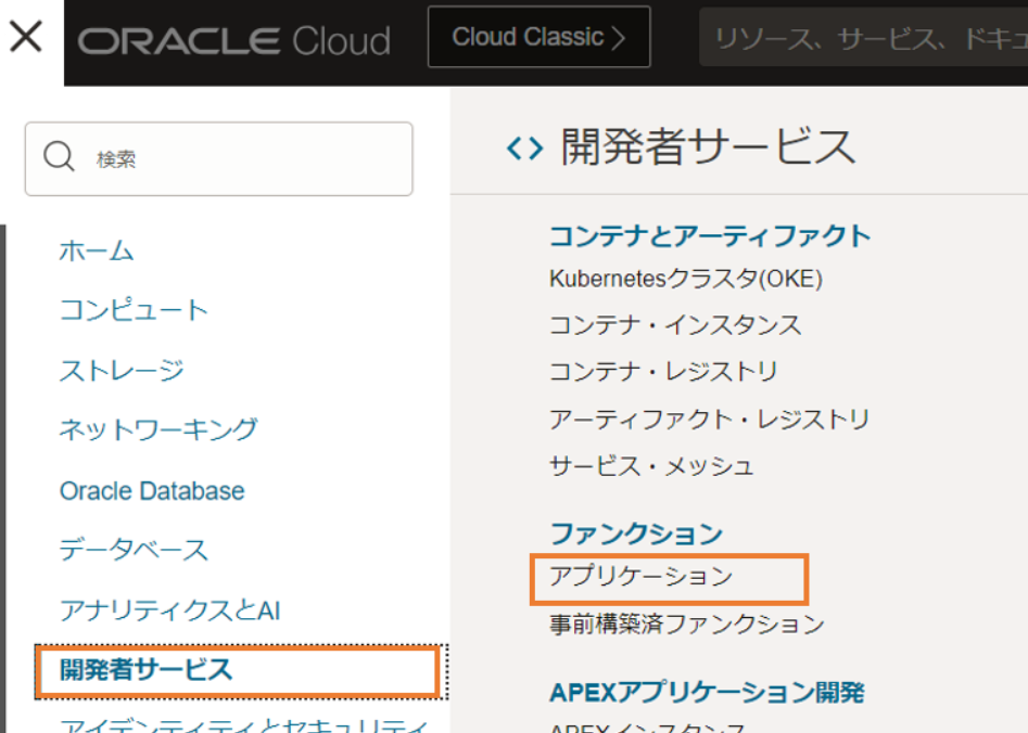 次に、アプリケーションをデプロイするOCI Functionsを作成します。画面左上のハンバーガーメニューから、「開発者サービス」を選択し、「ファンクション」の中の「アプリケーション」を選択します。