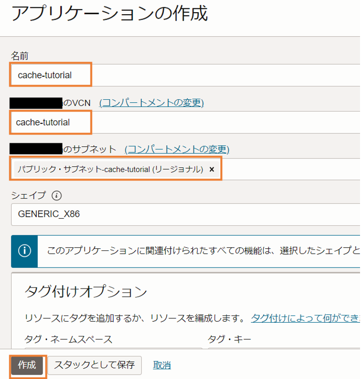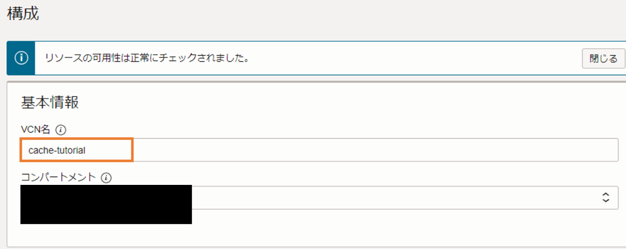 VCN名だけ任意の名前を入力して、後はデフォルトのまま作成します。ここではVCN名をcache-tutorialとします。