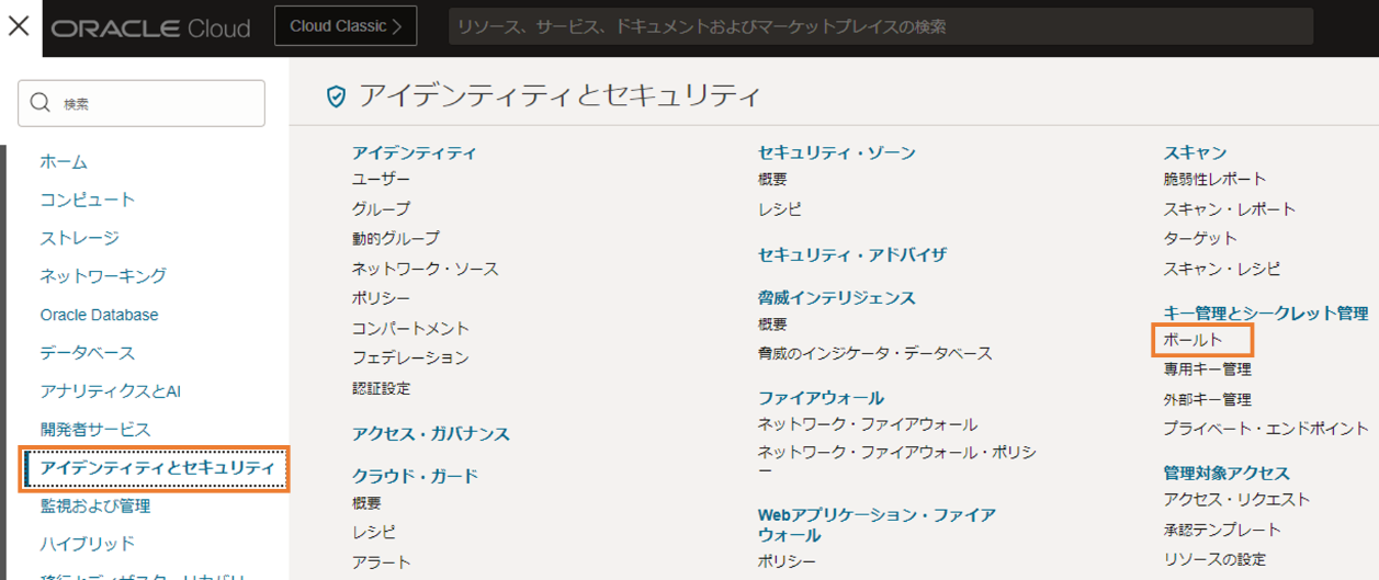 画面左上のハンバーガーメニューから、「アイデンティティとセキュリティ」を選択し、「キー管理とシークレット管理」の中にある、「ボールト」を選択します。