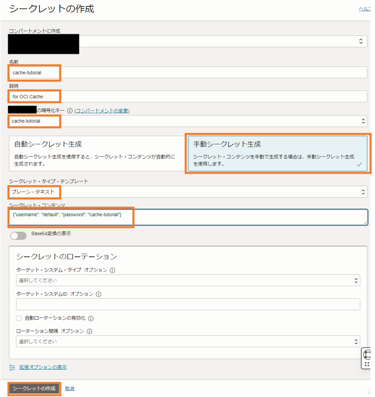 次に、API Gatewayがキャッシュサーバーにアクセスする際のシークレットを保存するためのVaultを作成します。なお、2024年9月現在ではOCI Cacheはパスワード認証を行うことができないため、ここで作成するシークレットはダミーのデータになります。ダミーではありますが、API Gatewayの「レスポンスキャッシング」機能は、Vaultのシークレットの選択が必須となっているため本手順は必ず実施する必要があります。