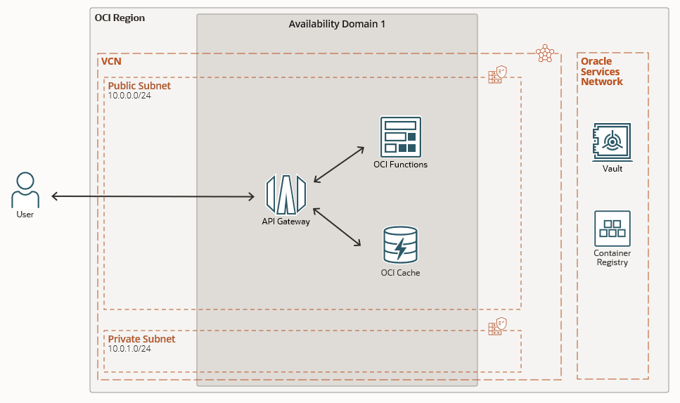 このチュートリアルでは、OCI Functionsに簡単なアプリケーションをデプロイし、そのAPIをAPI Gatewayで管理します。API Gatewayには「リクエストキャッシング」という機能があり、この機能を使うと、リクエストやレスポンスのデータを一時的に保存(キャッシング)できます。キャッシュにデータがあれば、それを使ってすぐに結果を返し、データがない場合にはアプリケーションから新たにデータを取得します。このキャッシュ機能には、OCI Cacheを使用します。