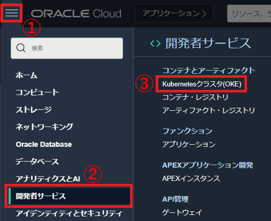 左上のハンバーガーメニューを展開して、「開発者サービス」から「Kubernetesクラスタ(OKE)」を選択します。