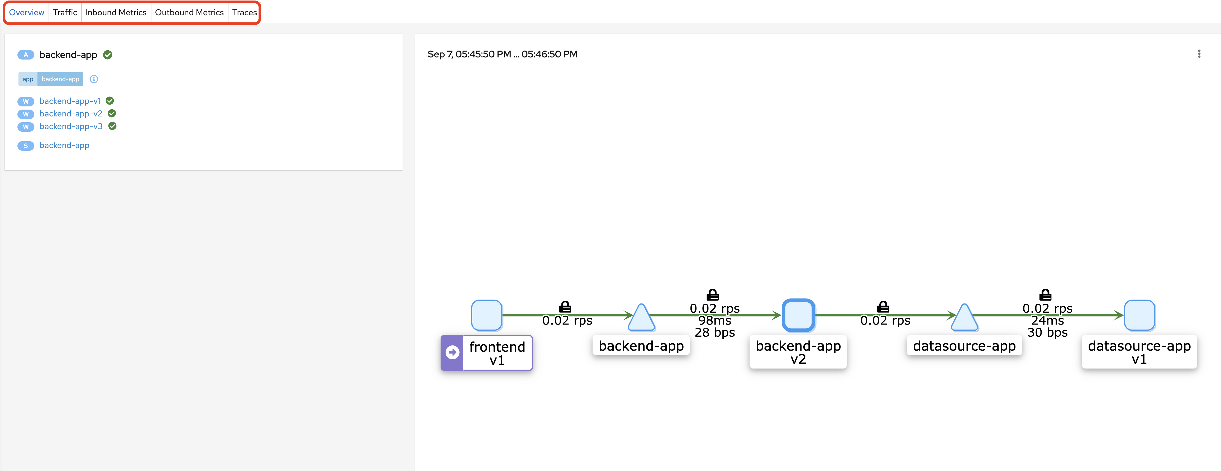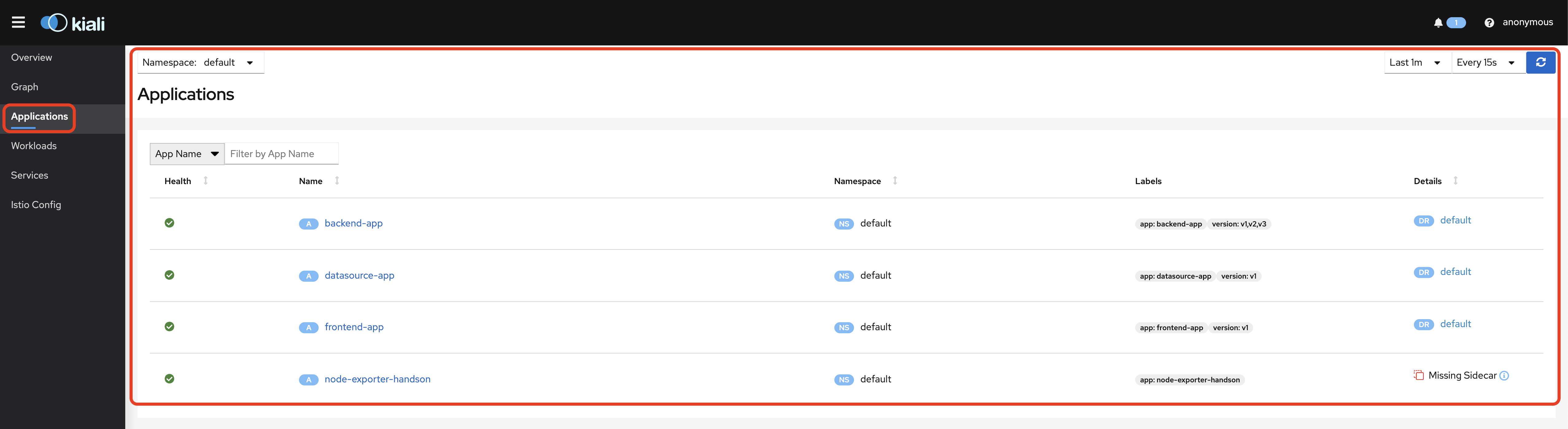 KialiのUIにアクセスし、Applicationメニューからbackend-appをクリックします。