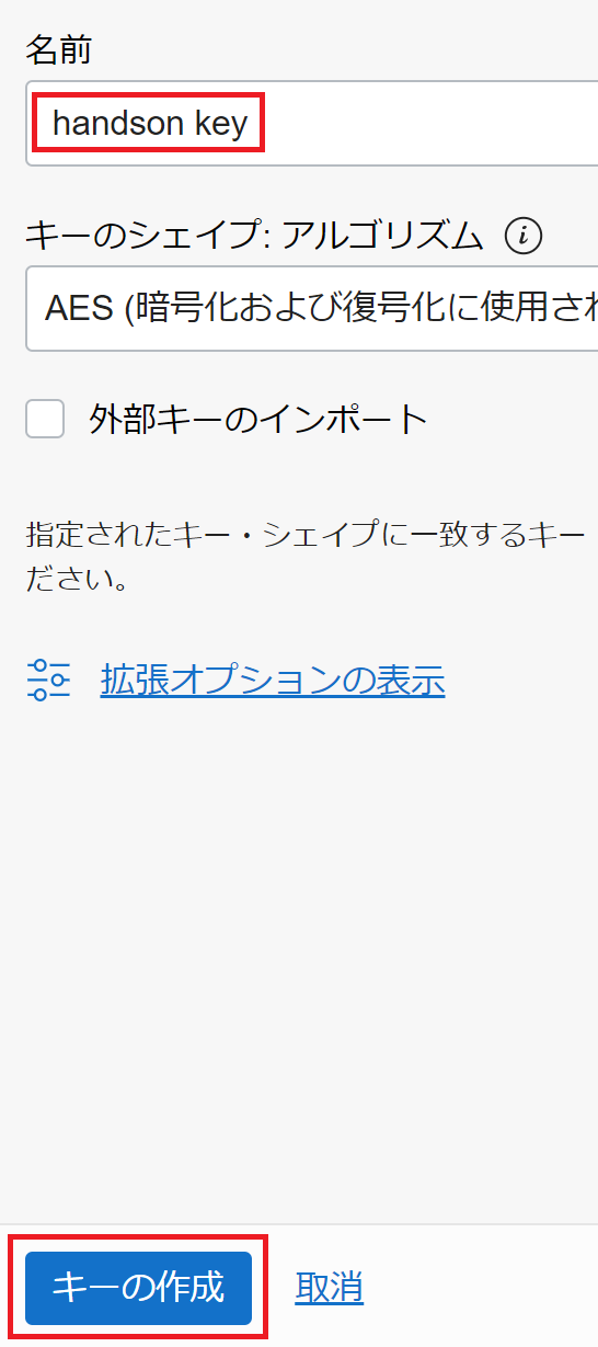 名前に「handson key」と入力し、「キーの作成」をクリックします。