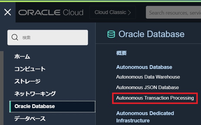 左上のハンバーガーメニューを展開して、「Oracle Database」から「Autonomous Transaction Processing」を選択します。