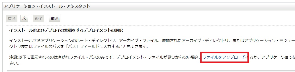「デプロイメント・アーカイブ」の「ファイルを選択」をクリックします。