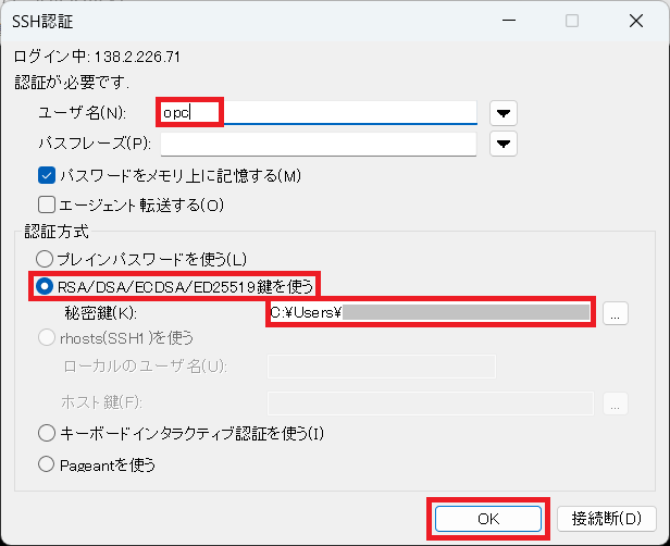 - パスフレーズ - 秘密鍵にパスフレーズが設定されている場合は指定してください。 下記は Tera Term を利用した場合の接続の設定例です。