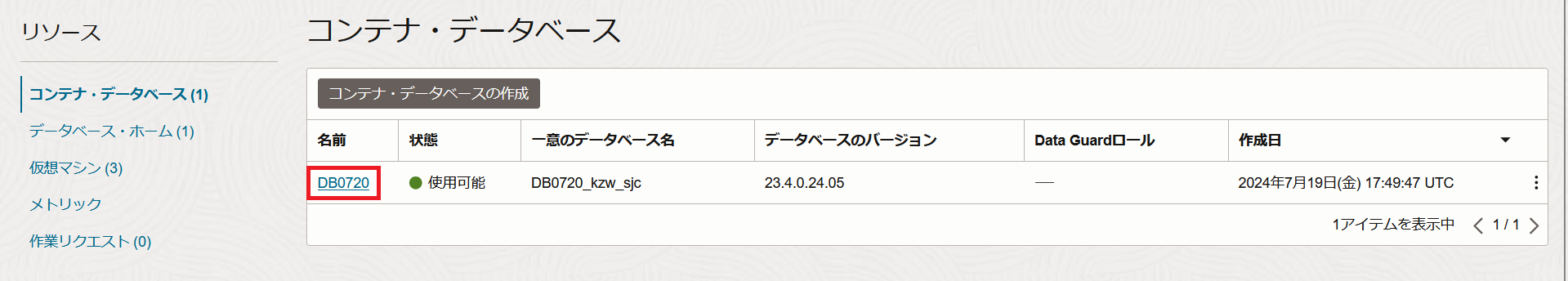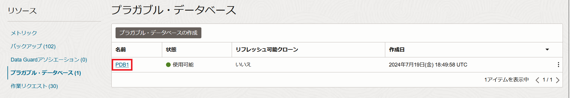 リソースの一覧からプラガブル・データベースをクリックします。