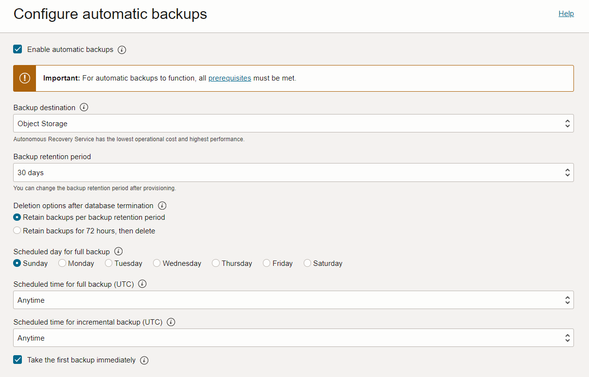 タスク2:コンテナ・データベースのプロビジョニングのステップ3の**「データベース・バックアップの構成」**でバックアップ保存先を設定します。 その際、デフォルト設定の Autonomous Recovery Service を使用する場合は、 Autonomous Recovery Service (RCV/ZRCV) をセットアップしようを参考に、セットアップを行ってください。 オブジェクト・ストレージを選択する場合は、セットアップ作業は不要です。
