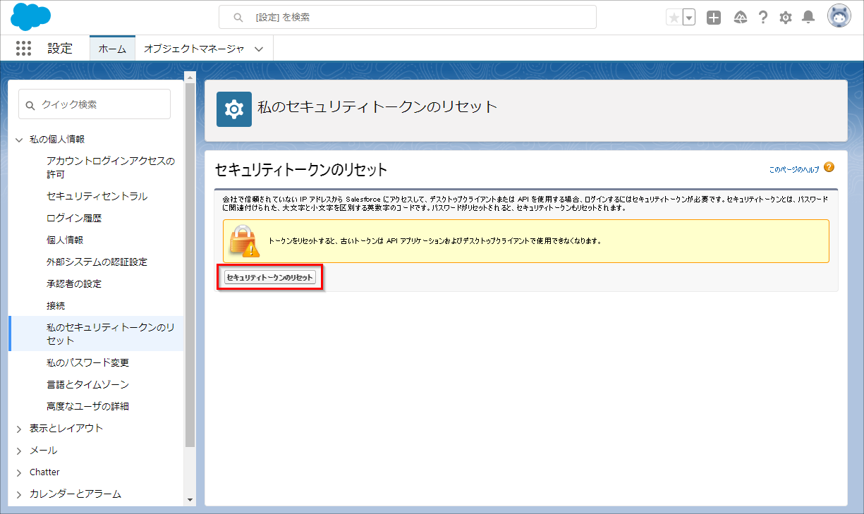 - 左ナビゲーションの 「私の個人情報」→「私のセキュリティトークンのリセット」 をクリックします。