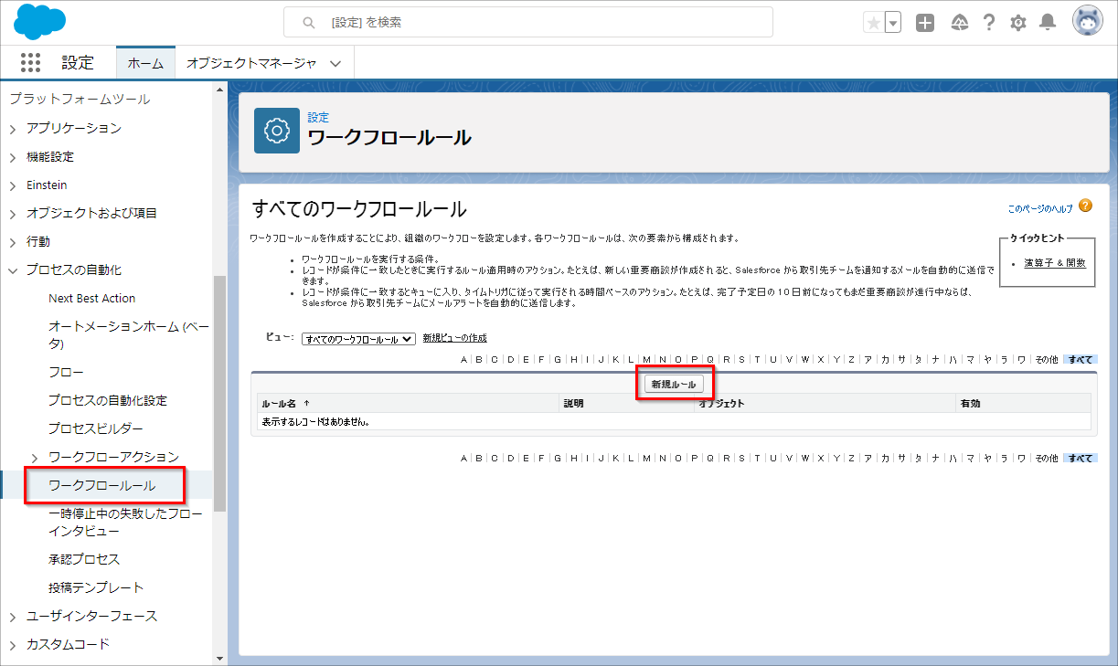 - 「プロセスの自動化」→「ワークフロールール」 をクリックします。