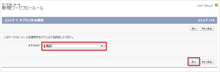 - オブジェクトで 「商談」 を選択し、「次へ」 をクリックします。