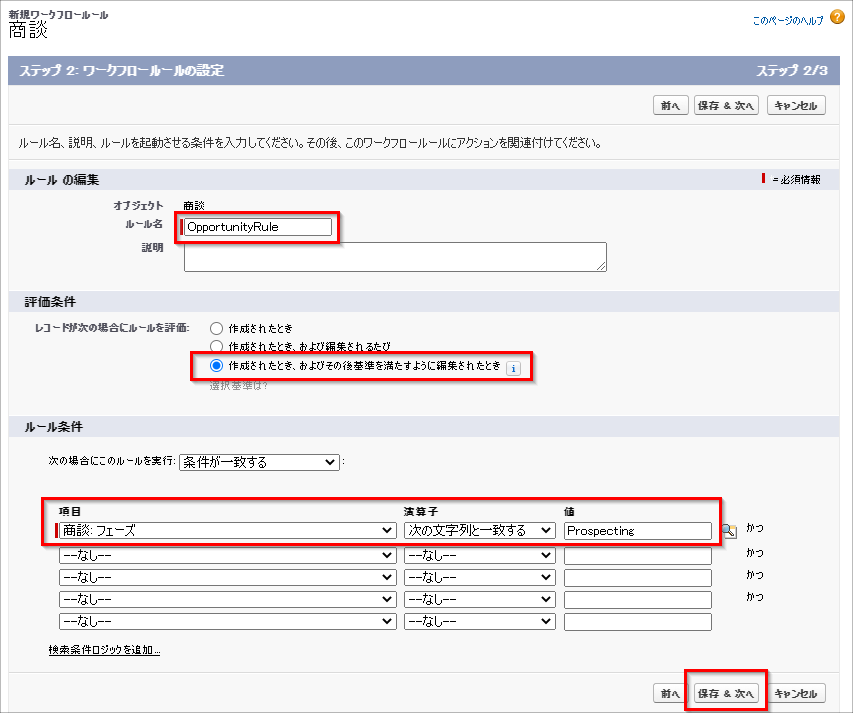 - ワークフロールールを以下の通りの設定し、「保存&次へ」 をクリックします。
