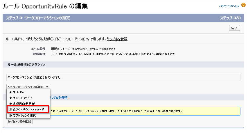 ワークフローアクションの MyOpportunityOutbound を開きます。