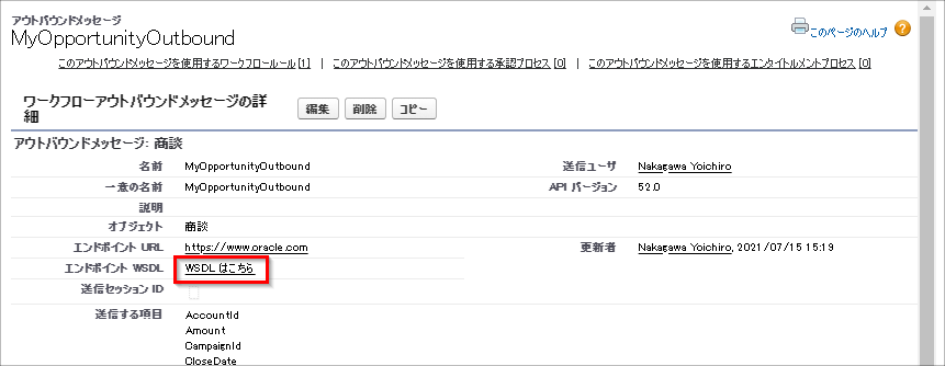 アウトバウンドメッセージの「エンドポイント WSDL」の 「WSDL はこちら」 クリックし、WSDL ファイル( wfoutbound.wsdl )をダウンロードします。