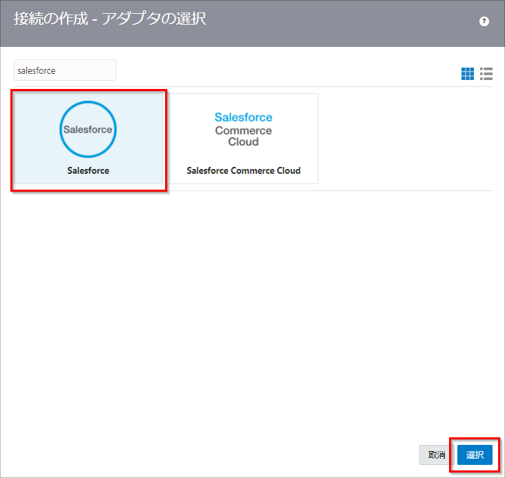 検索ボックスに salesforce と入力すると、Salesforce アダプタを素早く探すことができます。
