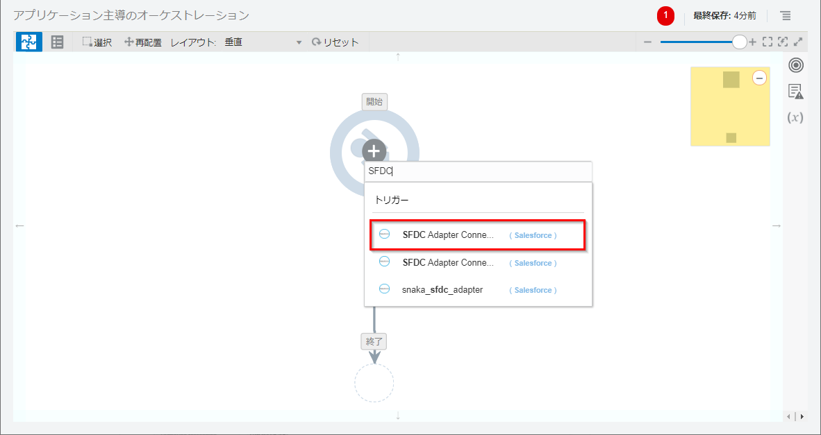 開始の 「+」 をクリックし、前の手順で作成した 「SFDC Adapter Connection」 を選択します。
