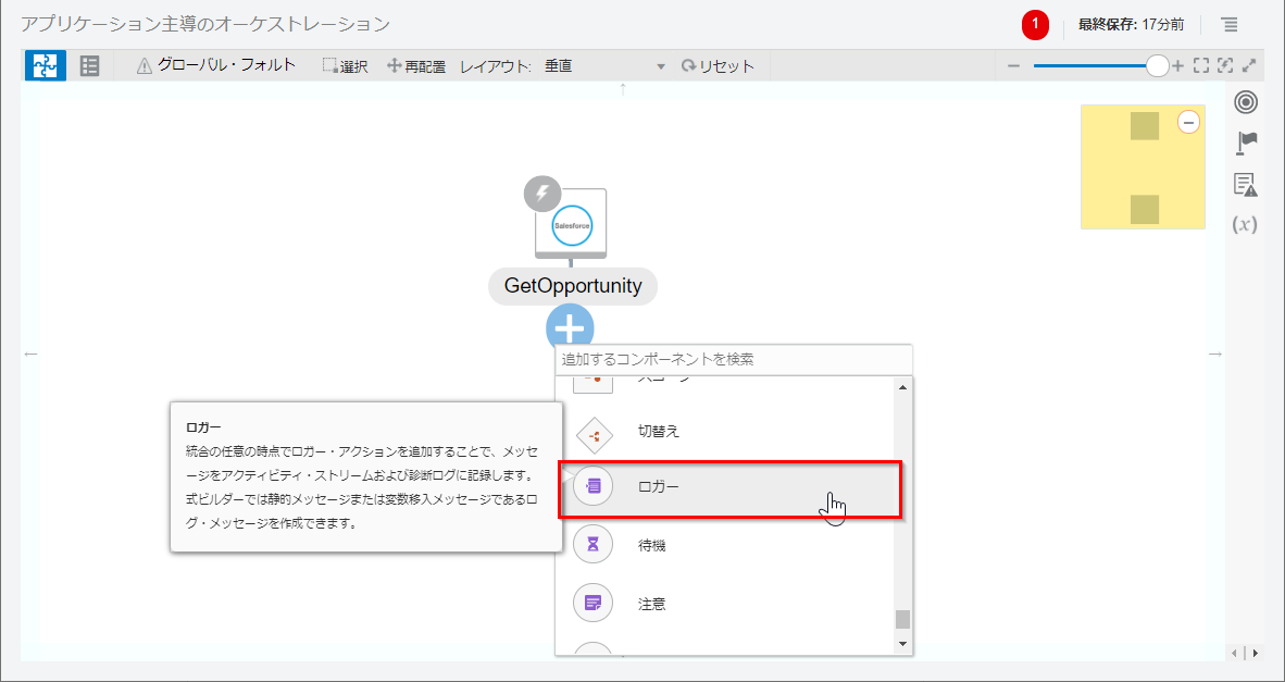 GetOpportunity から伸びる矢印の上にマウスをあわせ、「+」 をクリックし、追加するコンポーネントから 「ロガー」 を選択します。