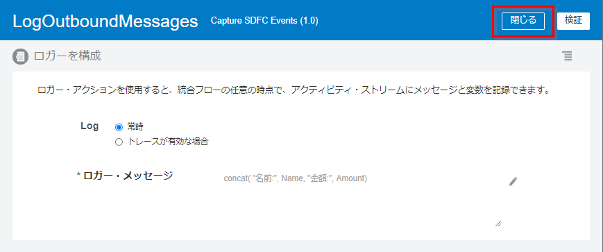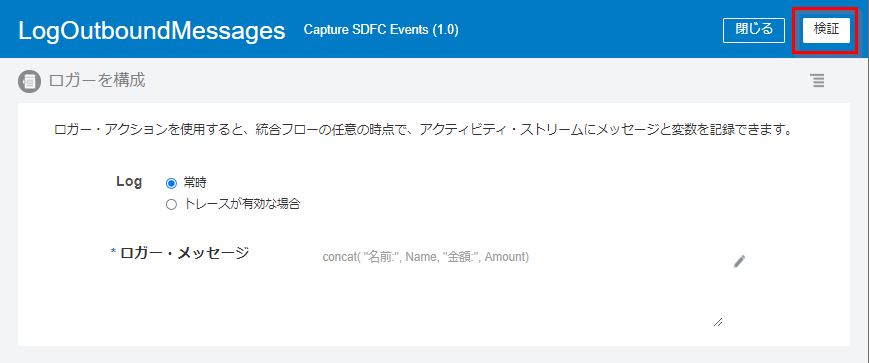「検証」 をクリックします。 「ロガー・アクションLogOutboundMessagesは有効で、使用する準備ができています。」 が表示されます。