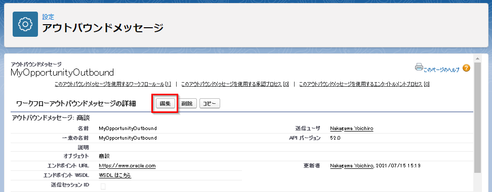 事前準備でダミーのURLを設定したSFDCのアウトバウンドメッセージのエンドポイントURLを、前の手順でアクティブ化した Capture SFDC Events のエンドポイントURLに変更します。