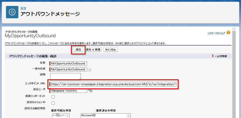 エンドポイントURL に入力した www.oracle.com を削除し、前の手順でコピーした Capture SFDC Events のエンドポイントURL を入力し、「保存」 をクリックします。