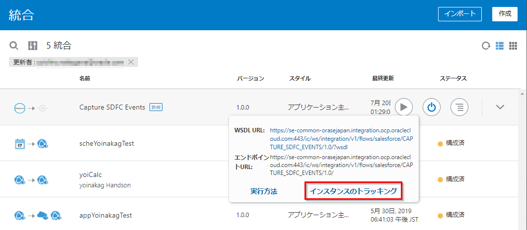 インスタンスのトラッキングは、OICホーム→モニタリング→統合→トラッキングよりアクセスできます。