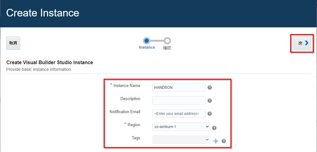 | Tags | Visual Builder Studioインスタンスに設定するタグ。今回は設定しない。 |