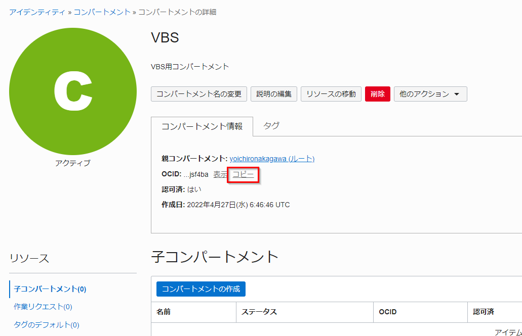 | 説明 | コンパートメントに対する説明を入力します。今回は"VBS用コンパートメント"とします。 |