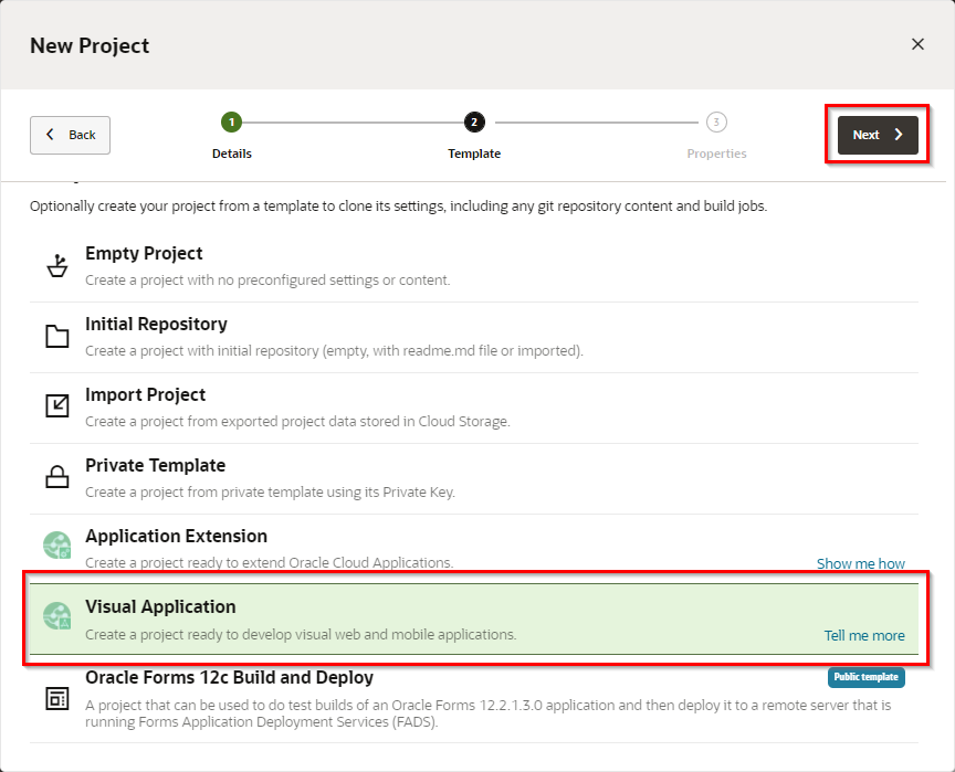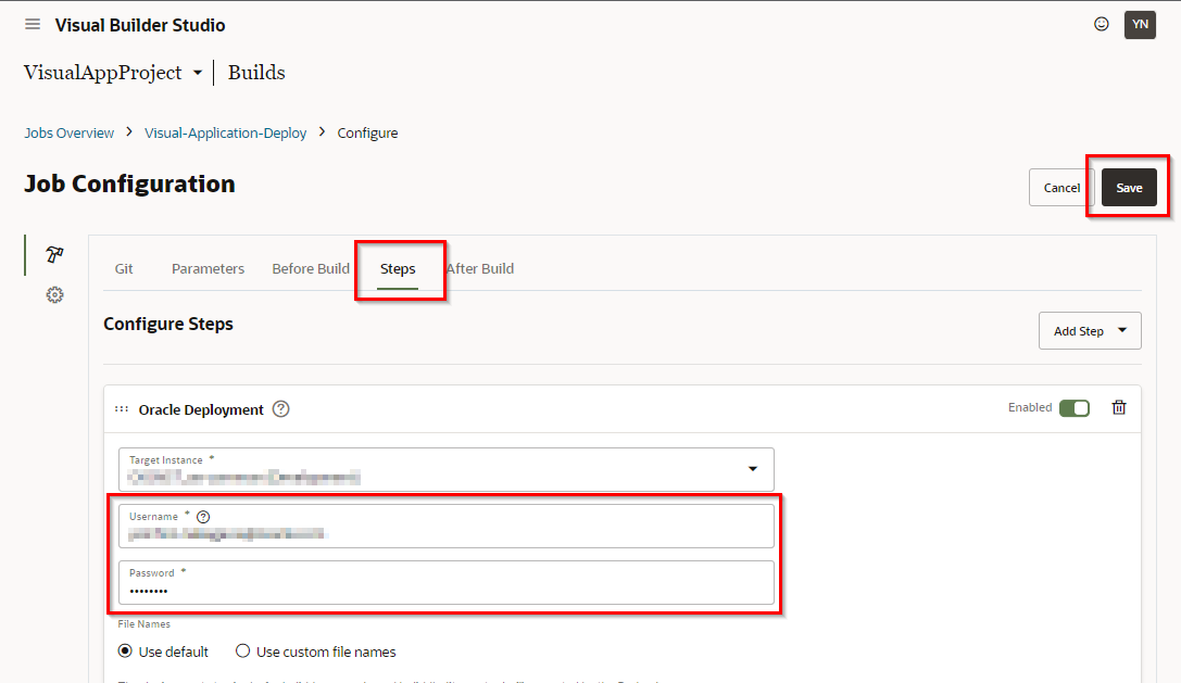 “Visual Application"のStepで利用しているVBCSインスタンスを設定します。