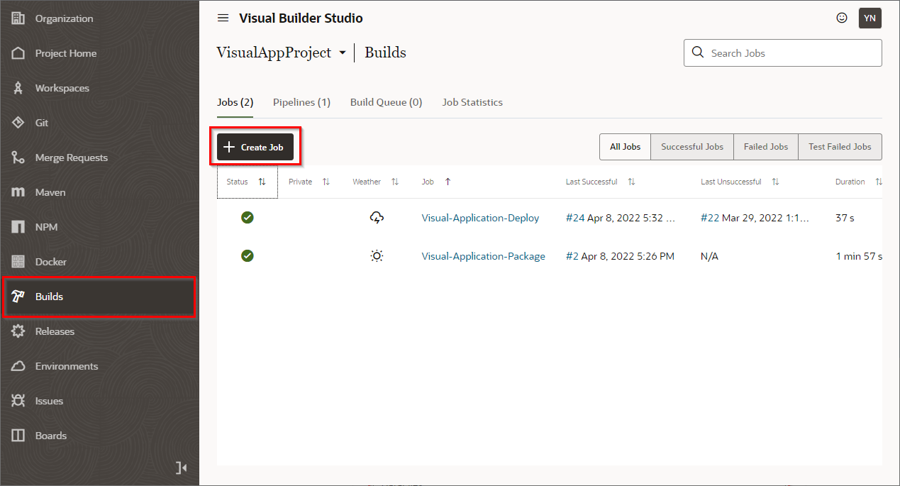 “Builds"の画面へ遷移し、“Create Job” をクリックします。