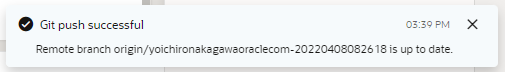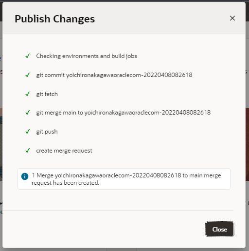 “Publish Changes” をクリックすると自身のブランチのリソースがmainブランチへマージされ、自動的にVisual Builder Studioのビルドジョブが実行されます。ビルドジョブが実行されると本番環境へ作成したビジュアル・アプリケーションがデプロイされます。