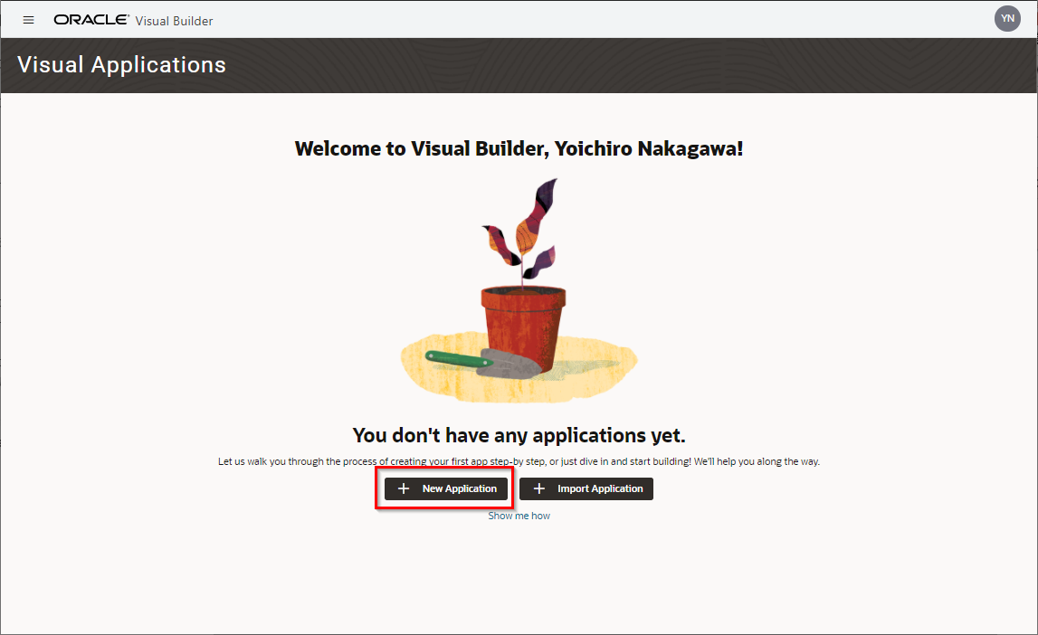 VBCSの「Visual Applications」ページが表示されたら、「New Application」ボタンをクリックします。