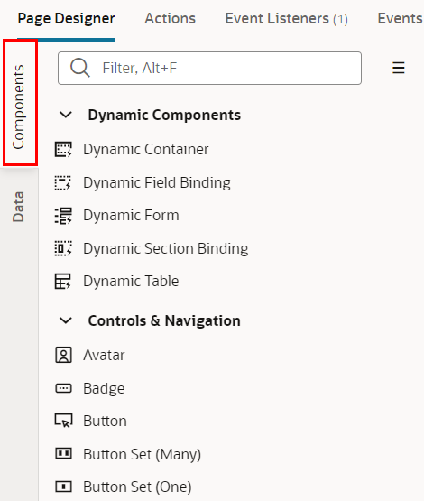 アプリケーション・デザイナの左側には、コンポーネント・パレットが表示されます。コンポーネント・パレットは、デザイナの左にあるコンポーネントタブで表示/非表示を切り替えることができます。