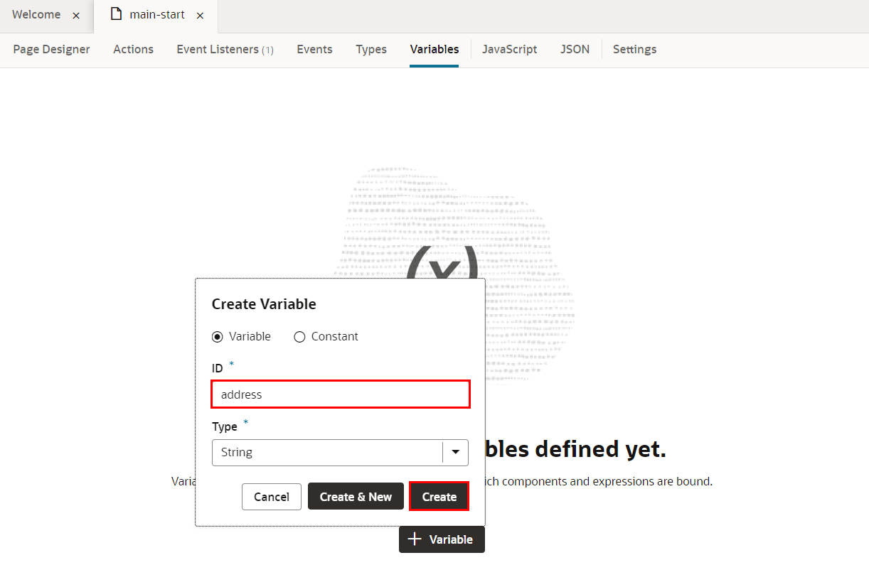 アプリケーション・デザイナの「Variables」タブをクリックします。「+ Variable」ボタンをクリックします。